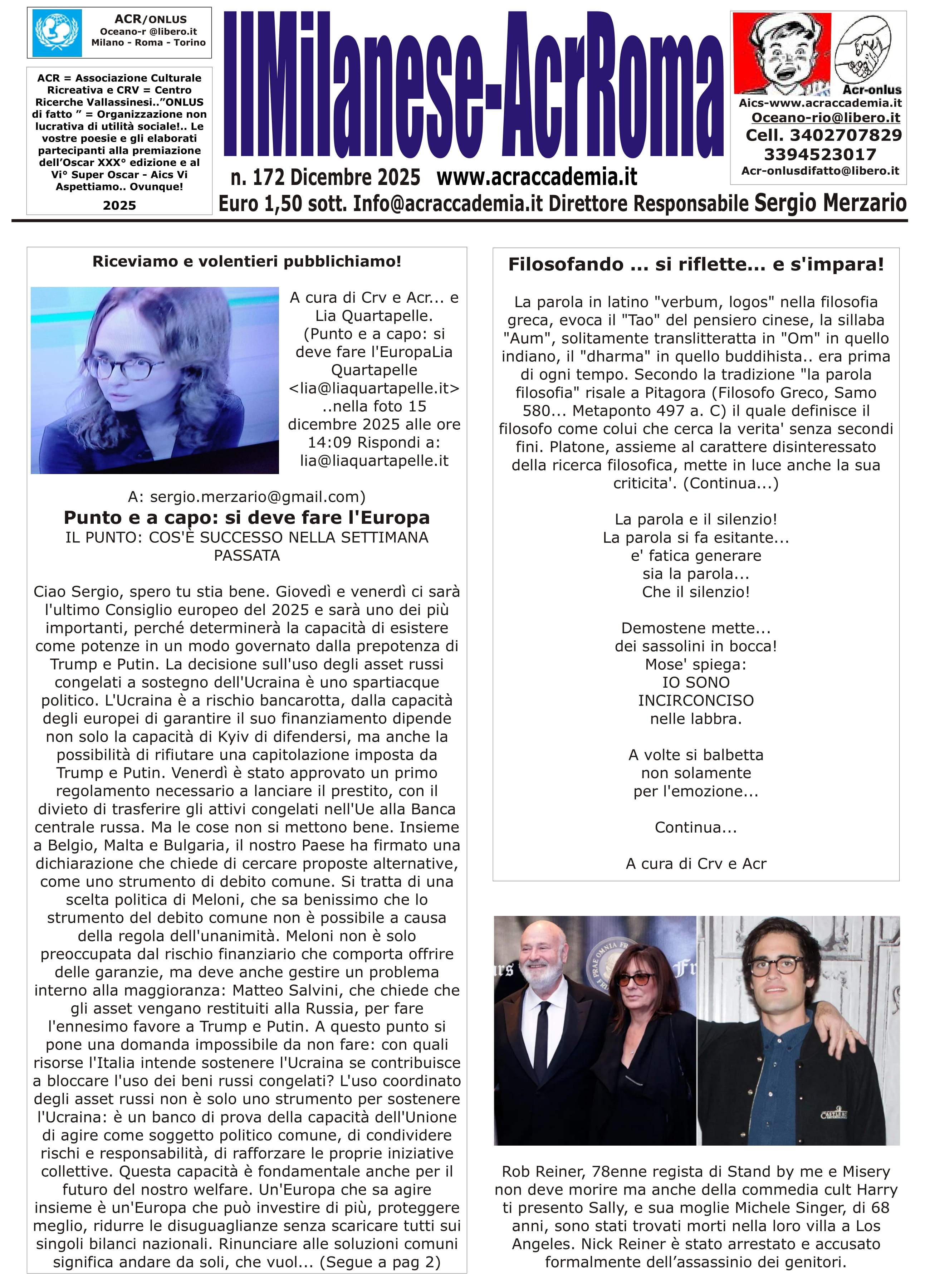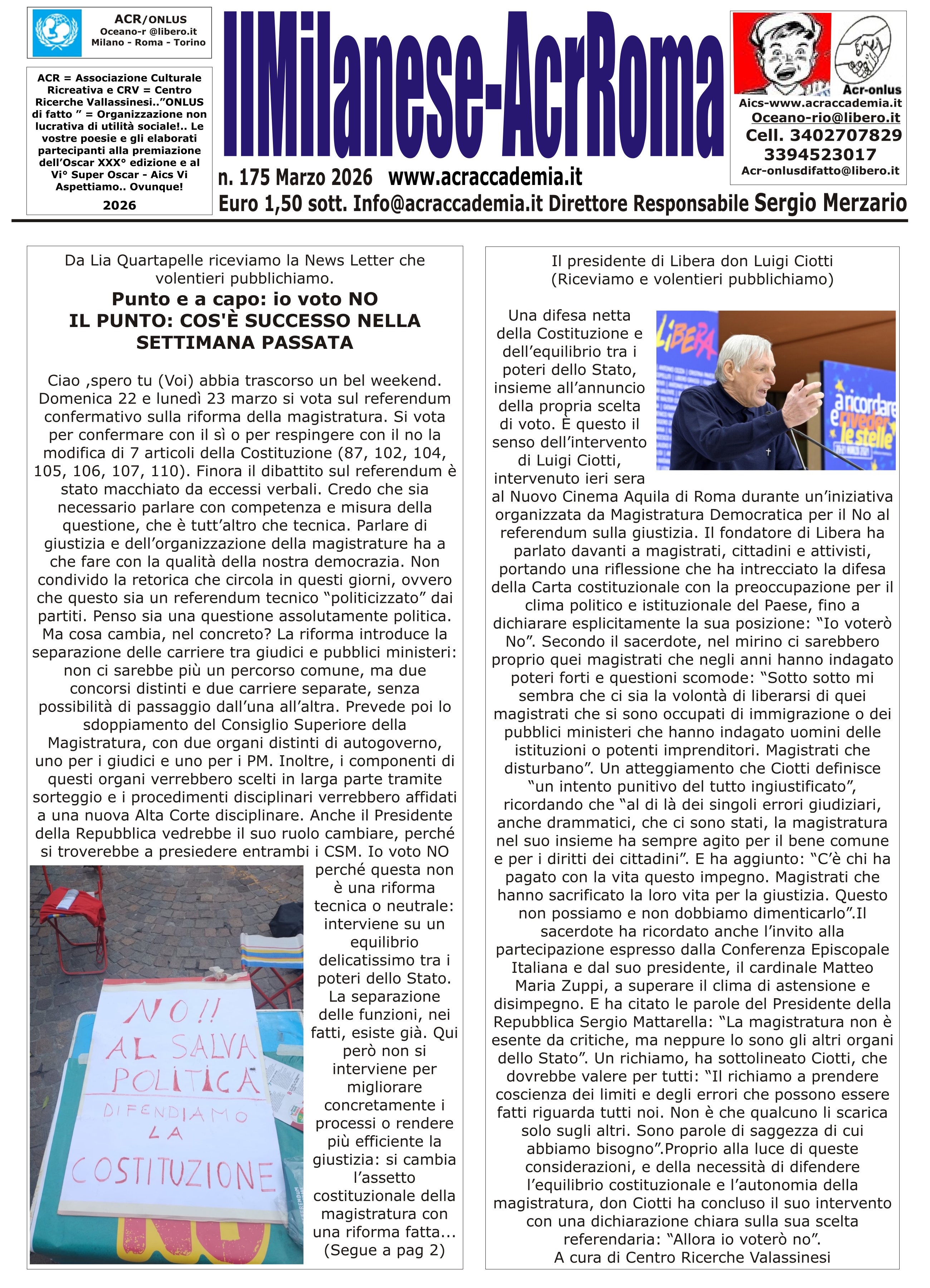 I giornali, il sito internet e i blog che sono di proprietą di Sergio Merzario vengono concessi in comodato d'uso gratuito all'acr per realizzare i progetti e le attivitą inerenti ai corsi e percorsi formativi senza ulteriori oneri salvo il rimborso spese sostenuto per pubblicarli e metterli in rete! Selezionare il giornale desiderato premendo il numero della pagina a fianco del nome della testata in uso all'ACR
